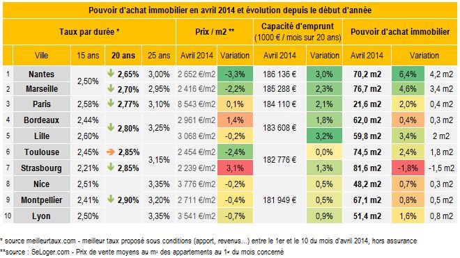 Meilleurtaux.com, courtier en crédit immobilier, publie chaque mois son palmarès des taux dans les 10 plus grandes villes de France. En avril, les taux négociés sur 20 ans reflètent tous la baisse générale des taux depuis janvier mais c’est Nantes qui remporte la 1ère place avec un taux exceptionnel de 2,65 %. Depuis le début de l’année, le pouvoir d’achat immobilier affiche des évolutions très favorables aux emprunteurs avec des hausses de plus de 3 à 4 m2 à Nantes ou à Marseille.