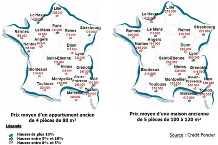 En 2012, dans les zones où la demande de logements excède l’offre disponible comme à Paris ou sur certains marchés touristiques du littoral méditerranéen, les prix devraient demeurer à des niveaux stables. Cependant, même ces marchés « privilégiés » devraient connaitre des réajustements. Il est donc possible que le rythme haussier s’inverse en milieu d’année pour un résultat proche d’une stabilité des prix à fin 2012. Sur tous les autres marchés, des baisses de prix 5 % à 10 % en moyenne (c’est-à-dire lissant des écarts plus importants sur des biens ou des situations atypiques) sont à prévoir, par simple effet d’érosion du pouvoir d’achat immobilier des ménages.