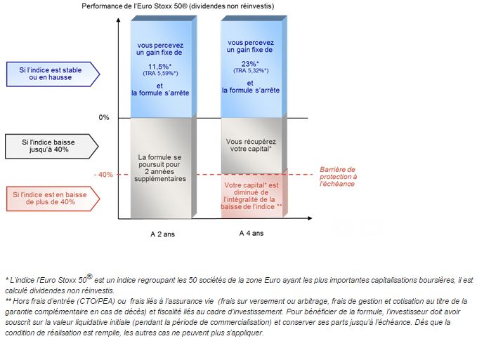 LCL Double Horizon (Nov 2014) et LCL Double Horizon AV (Nov 2014) permettent de connaître dès la souscription les gains potentiels. Si l’évolution de l’indice Euro Stoxx 50® (dividendes non réinvestis) est positive ou nulle par rapport à sa valeur initiale (moyenne arithmétique des cours de clôture de l’Euro Stoxx 50® dividendes non réinvestis aux dates de constatation suivantes : 29 et 30 décembre 2014 et 2 janvier 2015), les fonds offrent un gain fixe de 11,5%* à 2 ans (Taux de Rendement Annuel Brut ou TRAB de 5,59%*), ou 23%* à 4 ans (TRAB de 5,32%*). Le capital* est restitué jusqu’à une baisse de l’indice de 40% à l’échéance. Au-delà d’une baisse de l’indice de plus de 40% à l’échéance, le capital* est diminué de l’intégralité de la baisse de l’Euro Stoxx 50®(dividendes non réinvestis) et le souscripteur supporte une perte en capital.